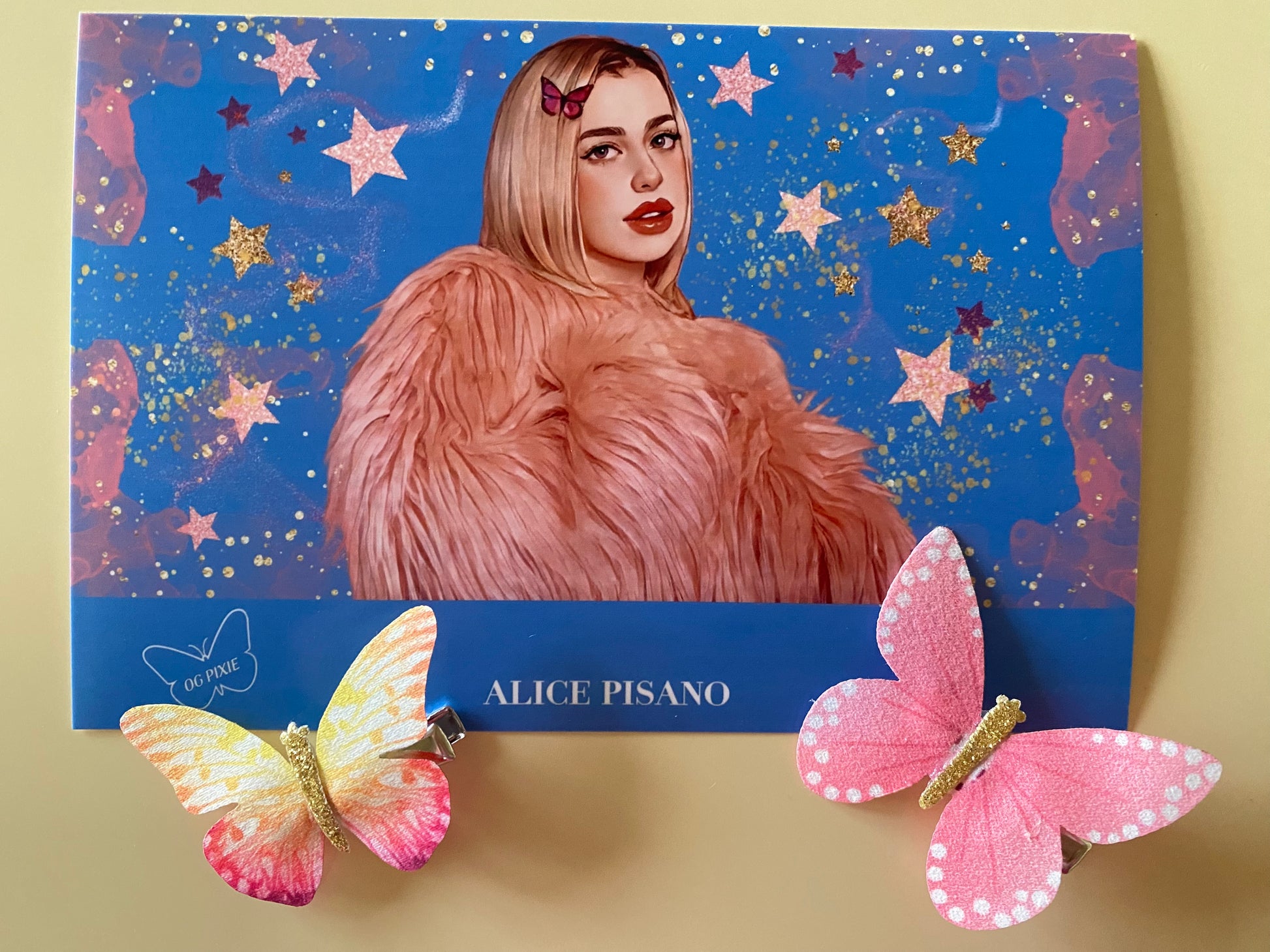 You’ll get a signed card with a heartfelt, personalised message straight from Alice, paired with two butterfly clips in a surprise colour to add a pop of charm to your hair or bag.